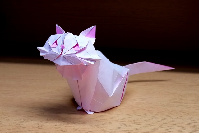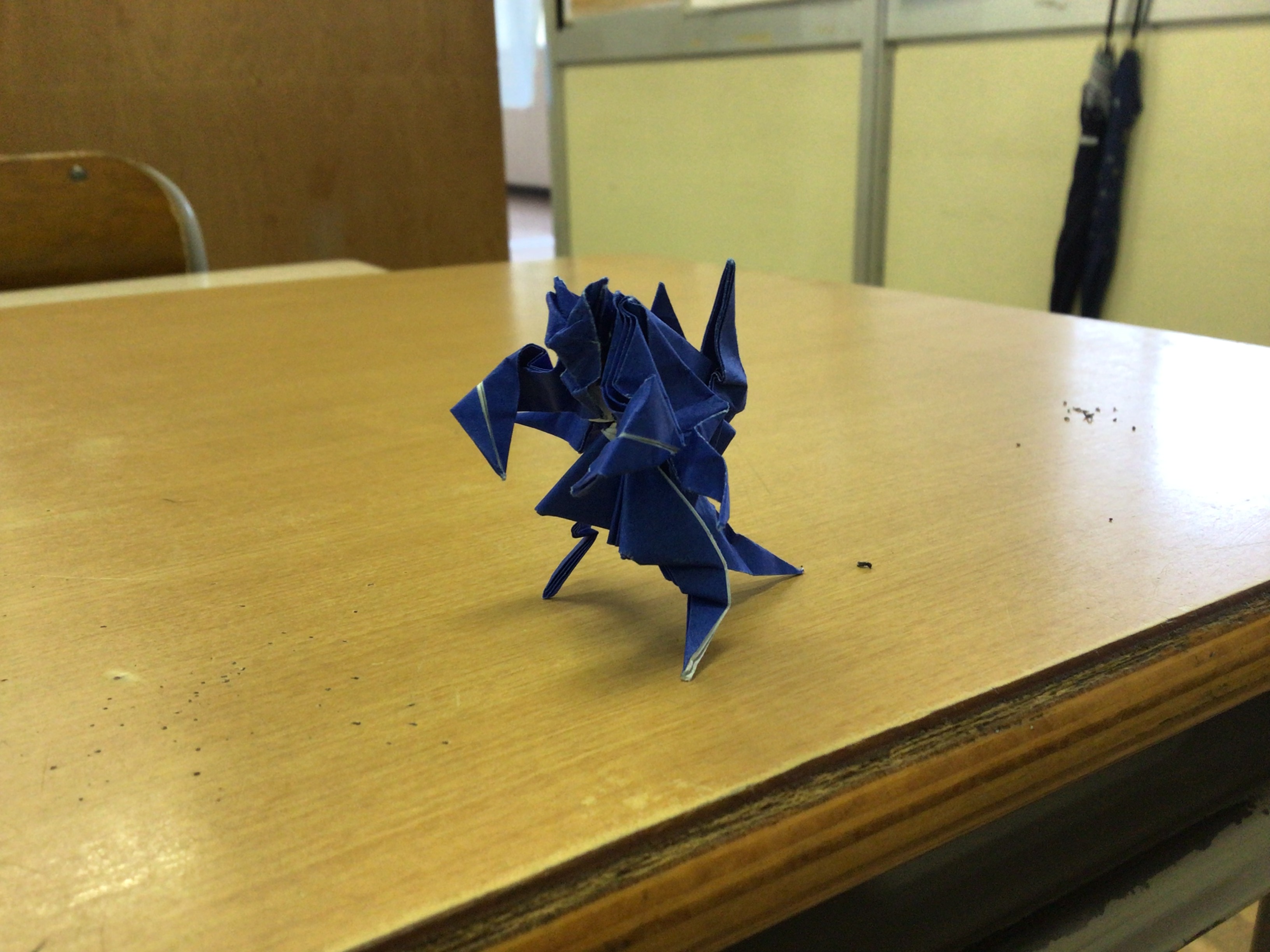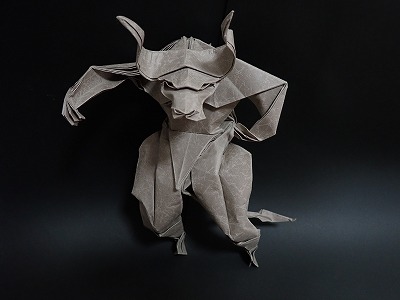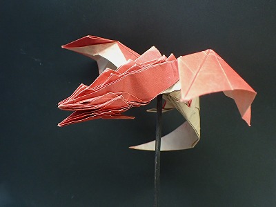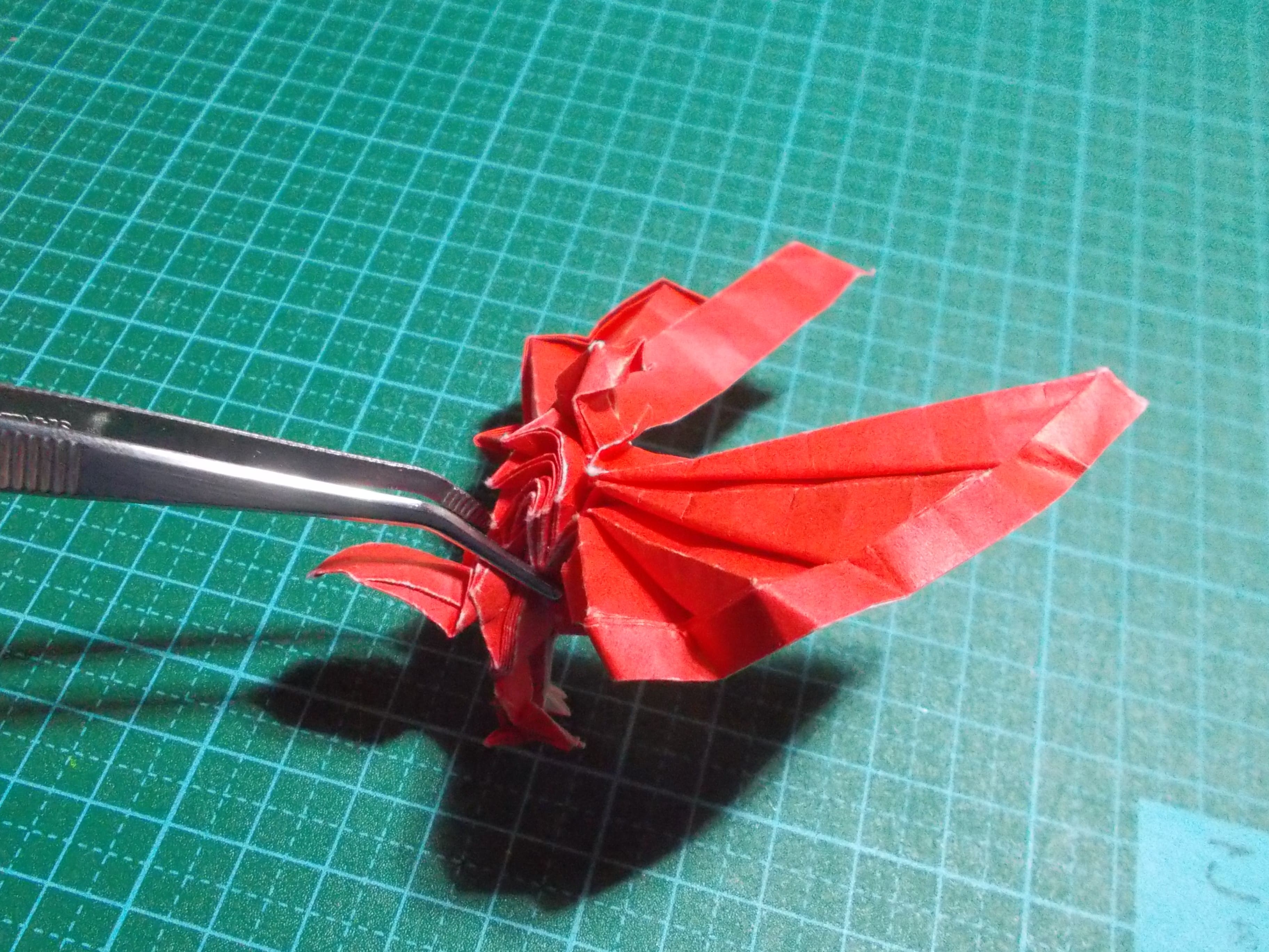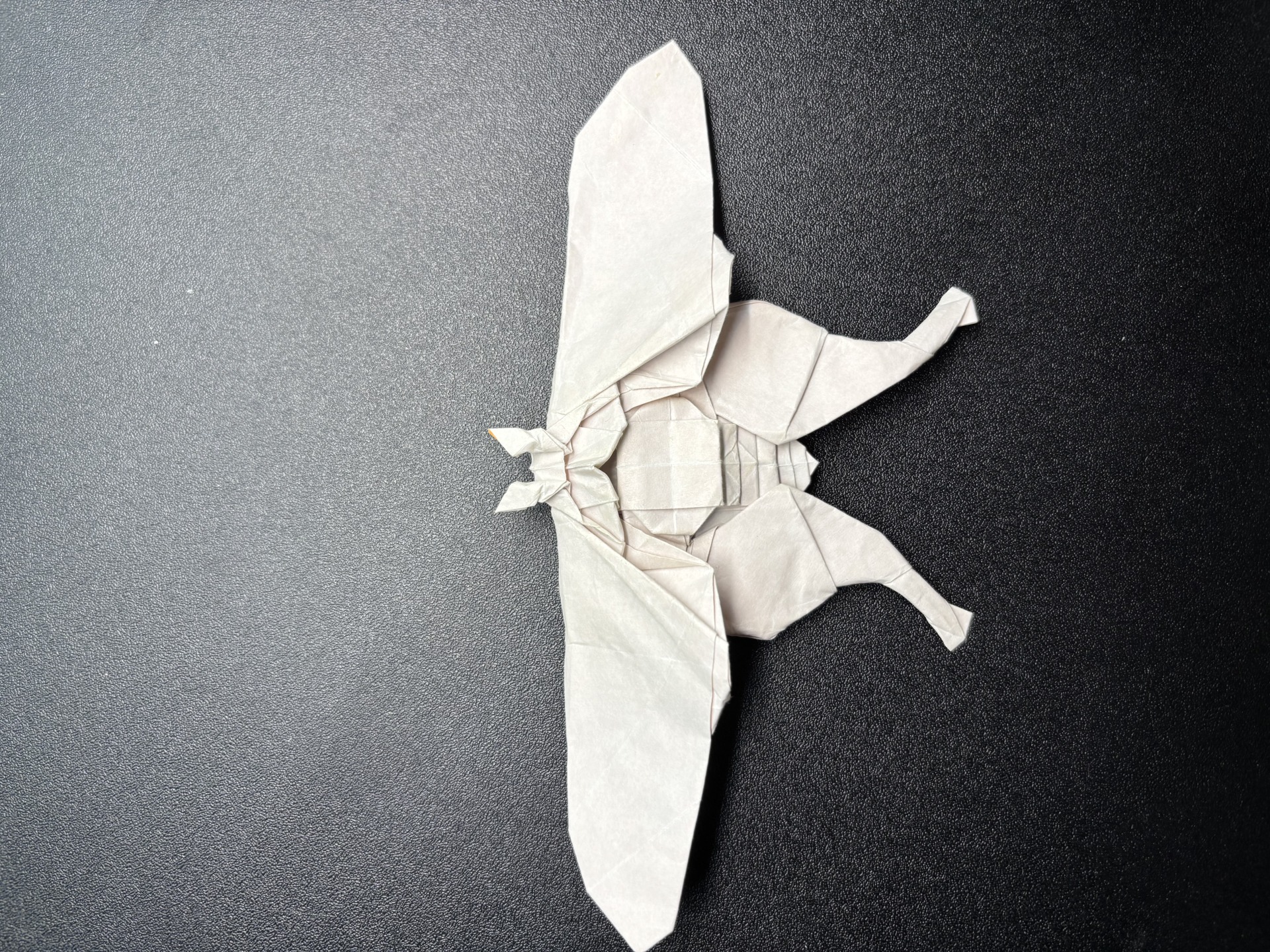 -(53 KB)過去作失礼します。2022年、中3のときの作品。僕が折り紙を始めるきっかけの一人となったジョン·モントロール氏のデザインを全体的にオマージュしつつ、構造はよくやる鶴ベースです。一部をオマージュするわけではなく、彼の作品群に見られる本質的な意匠をオマージュしたつもりです。古典的な頭部や丸みを帯びた翼、あえて指を折り出さない点などです。
