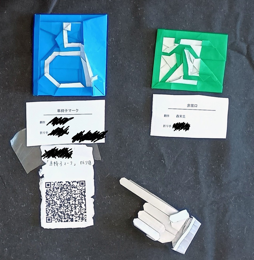 -(287 KB)森末圭さんの「非常口」のようなインサイドアウト作品を作りたいと思い、ピクトグラムとして有名な非常口があるならば、と作った作品です。頭の部分の構造はほとんど非常口と同じです。10x6.5のサイズで作っており、非常口に使う紙1辺の3分の5の長さを長辺におくと非常口と横幅が同じになります。折り図をQRコードに書いたので(手描きだけど)よければ見てください。