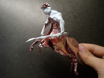 -(56 KB)シンプル馬で持て余した角がもったいなかったので、引き出して前脚にしました。糊なしの裏打ちで、ほぼ重ね折りのようになりましたが、赤と金に加えて、少しちらついている白がよりめでたい雰囲気を出してくれました。が、勝田さんのマガモとやってること変わらんなぁ