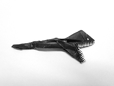 キム・ドンヒョンさんのティラノのように対角線蛇腹を利用して折りだされる90度の歯を、22,5度にしたらどうなるか?というアイデアから生み出された折りゴミ。